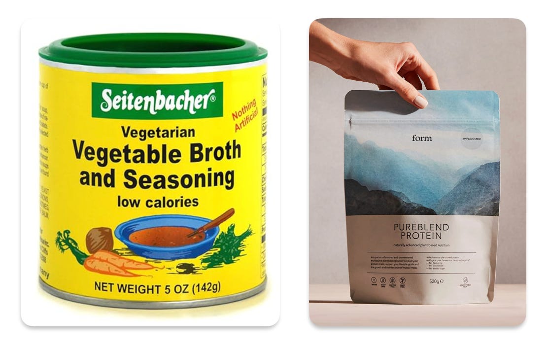 Lately, I’ve started adding veggie broth powder and unflavored protein powder (this is my favorite) to hot water and drinking it as soup. Let me tell you: it works. I’ve been looking for a savory protein drink, and this is it. I can make it in less than two minutes (literally, not figuratively) and it feels healthy when I’m time-strapped.