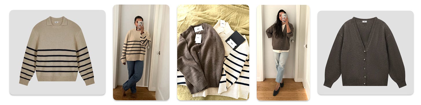My winter uniform is knitwear with jeans. My denim usually rotates between a straight leg (love a vintage 501 or my favorite Toteme) and a wide leg (the COH Ayla is the GOAT). But I love having more options for tops. I got two new knits from the new brand 44ome, and the quality is amazing. Most of the pieces I own are chunky, but these are a lighter knit while still being oversized. They are slotting into my rotation so well. The yak boyfriend cardigan especially is incredibly soft and looks great with different colored t-shirts underneath. I also love wool and cotton blend striped polo sweater, it’s got such an unusual neck that it creates a point of interest that I crave in my outfits. I also find the price point reasonable for the great quality.